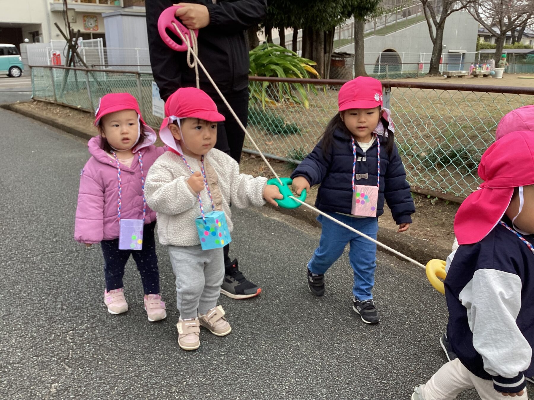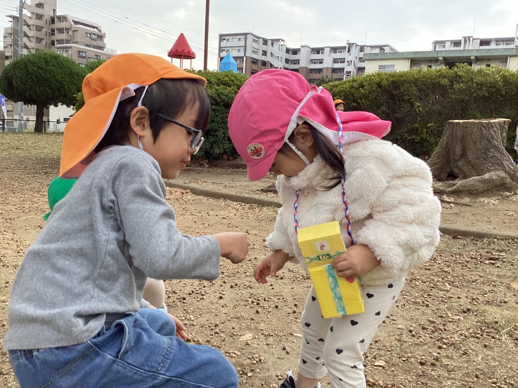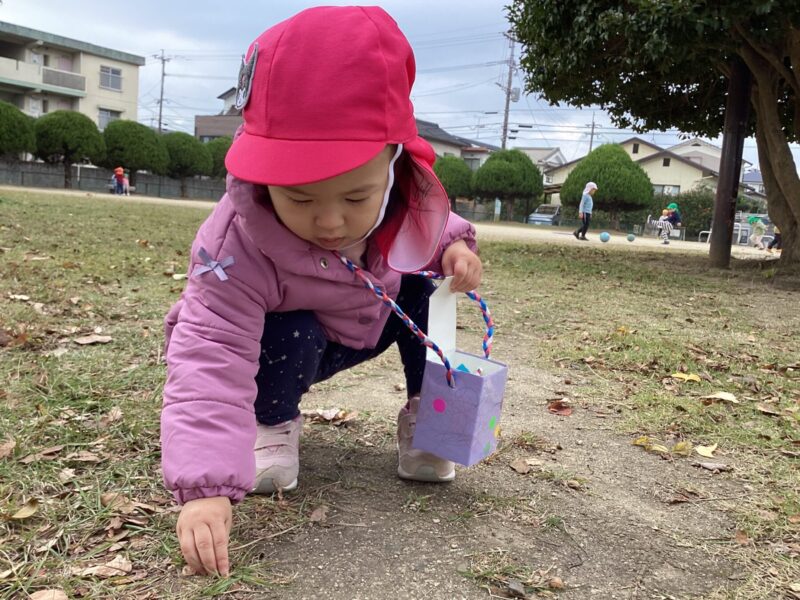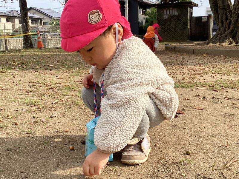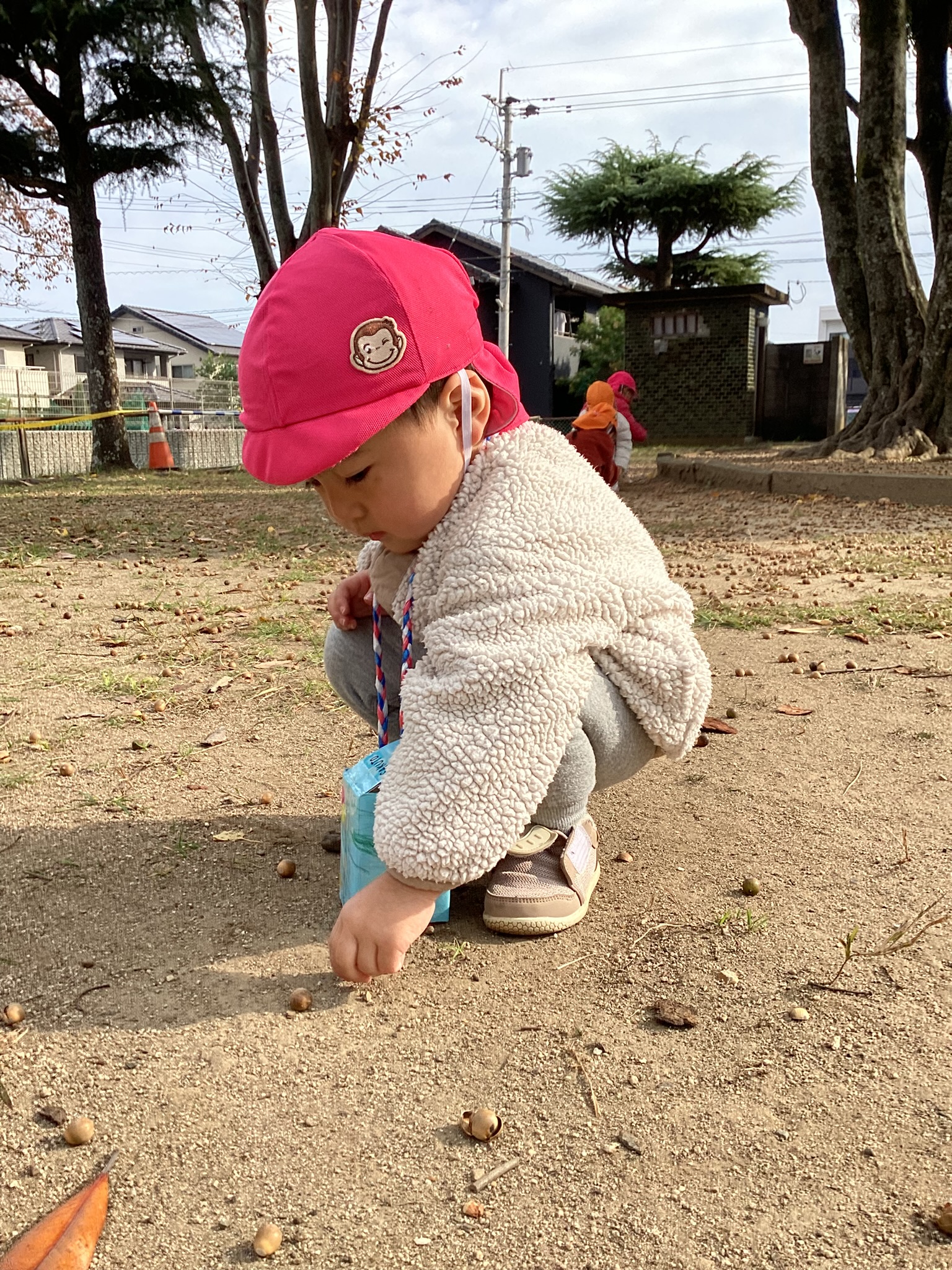 お手製の散歩バックを持っていざどんぐり拾いに出発!一面に落ちているどんぐりに目をキラキラ輝かせながら1粒ずつ拾ってはバックに大切に入れる子どもたち。中にはバックのふたが閉まらないくらいたくさん見つけた子どももいました。期間限定の特別な散歩、子どもたちも目で見て手で触れて〝秋〟を存分に楽しむことができました。 若林