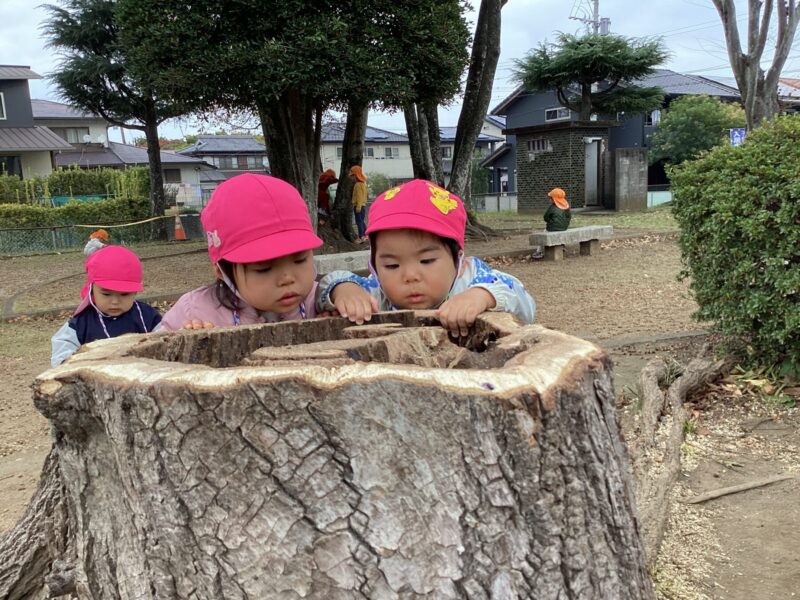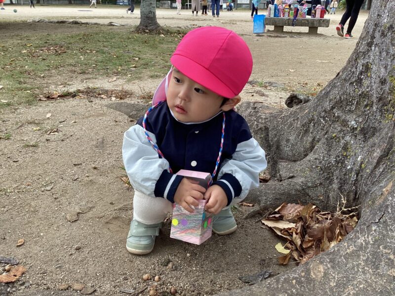 今月は天気にも恵まれ過ごしやすい気候の中、戸外活動をたくさん楽しみ1歳児つくし組の子どもたちも、毎日園庭や保育園の隣の若葉公園で体をたくさん動かして遊びました。公園の大きなどんぐりの木には、今年もたくさんのどんぐりが実り、秋が来たことを知らせてくれました。
