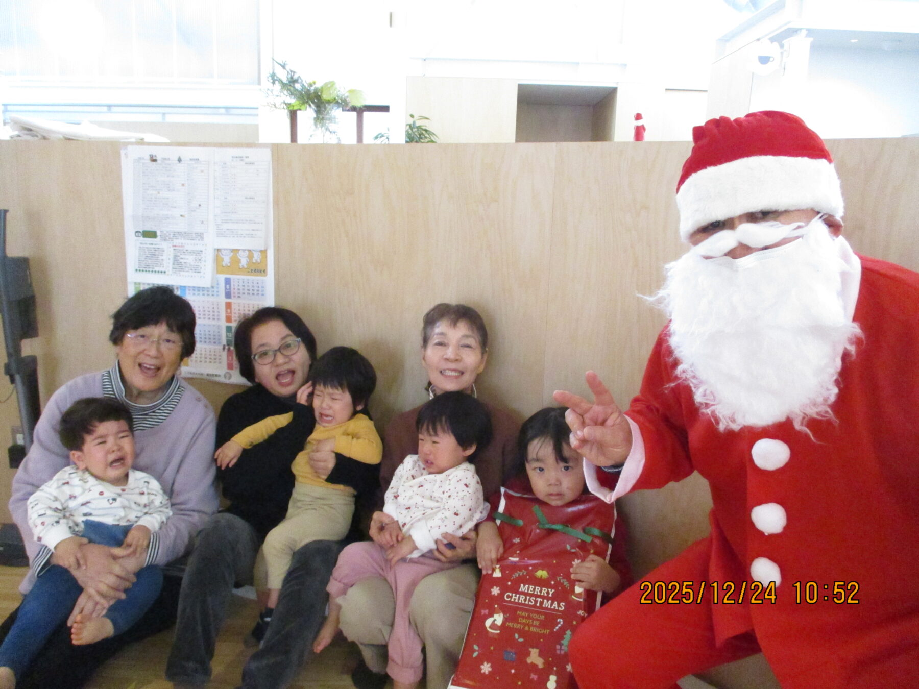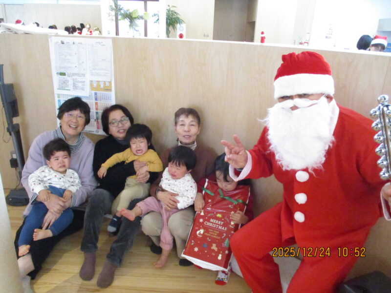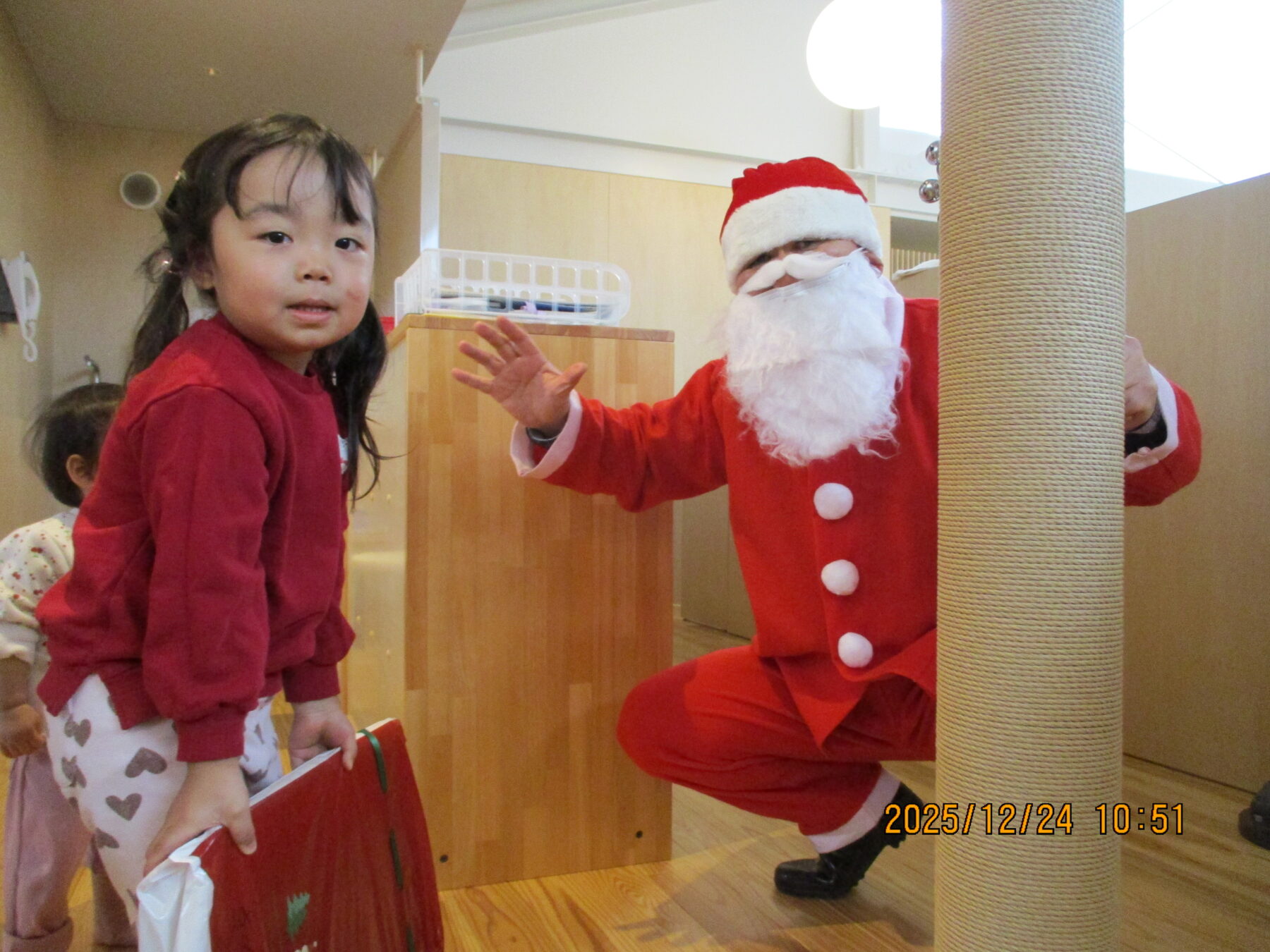 さくらんぼ組にさんたがきました。鈴をならしプレゼントを持ってやってきました。子ども達も驚きながらプレゼントをもらいとても喜んでいました。