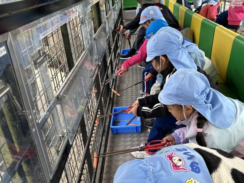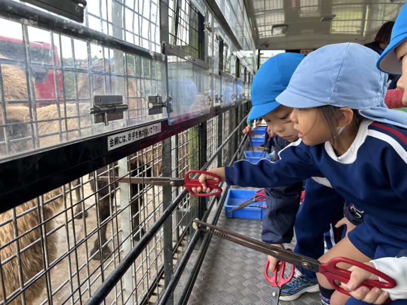 恐る恐る、ハサミでエサをあげたり友達と会話を楽しんだりしながら餌やりをすることができました。
