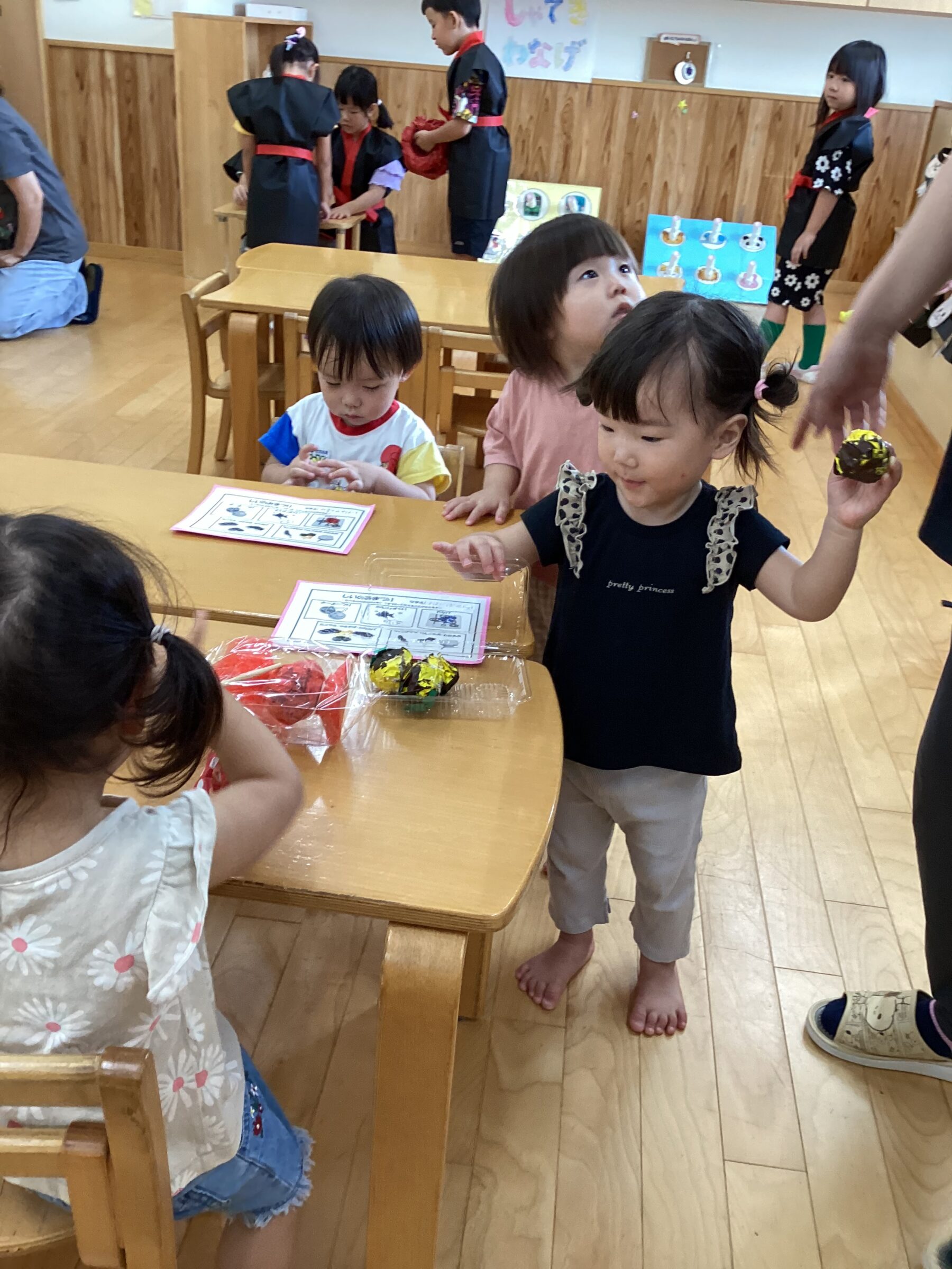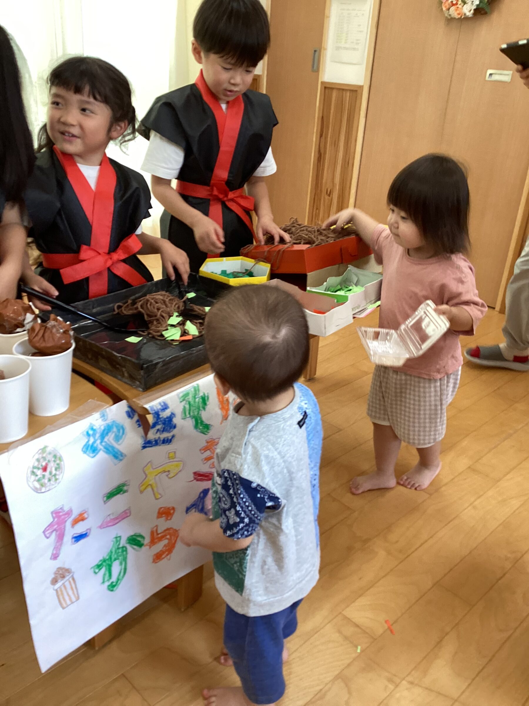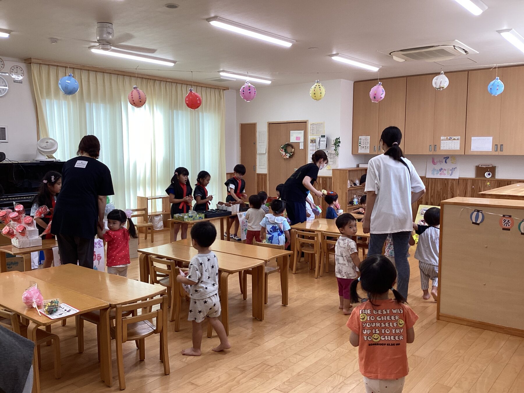 保育室に訪れると様々な出店があり、ハッピを着たお兄さんお姉さんが出迎えてくれました。興味津々の子ども👦🧒たちは、出店で選んだ品物をもらい、とても嬉しそうでした。