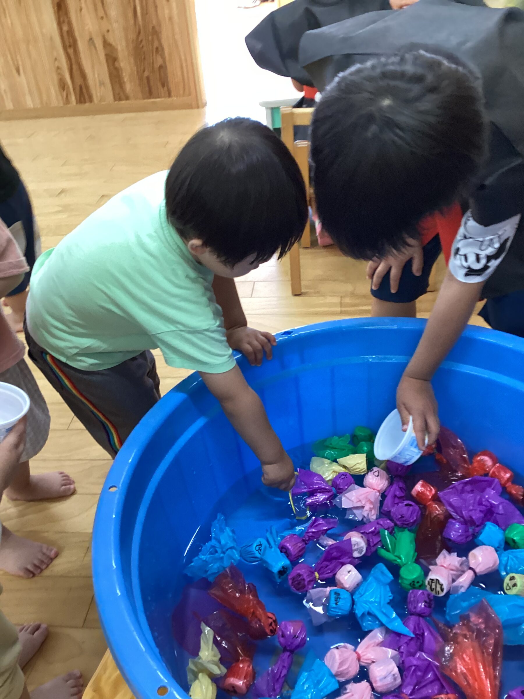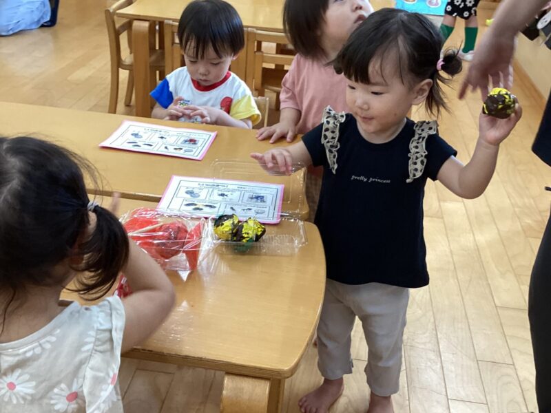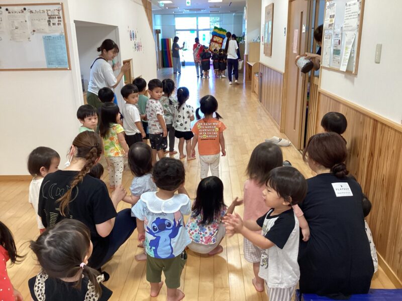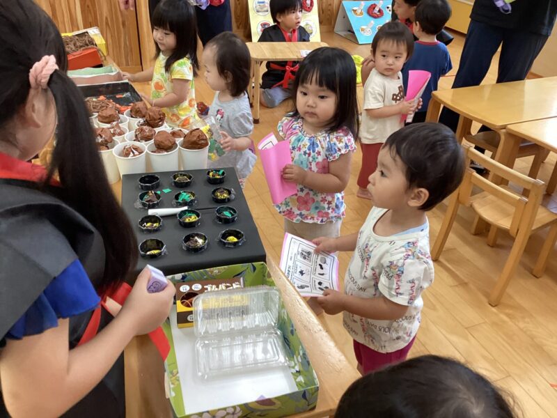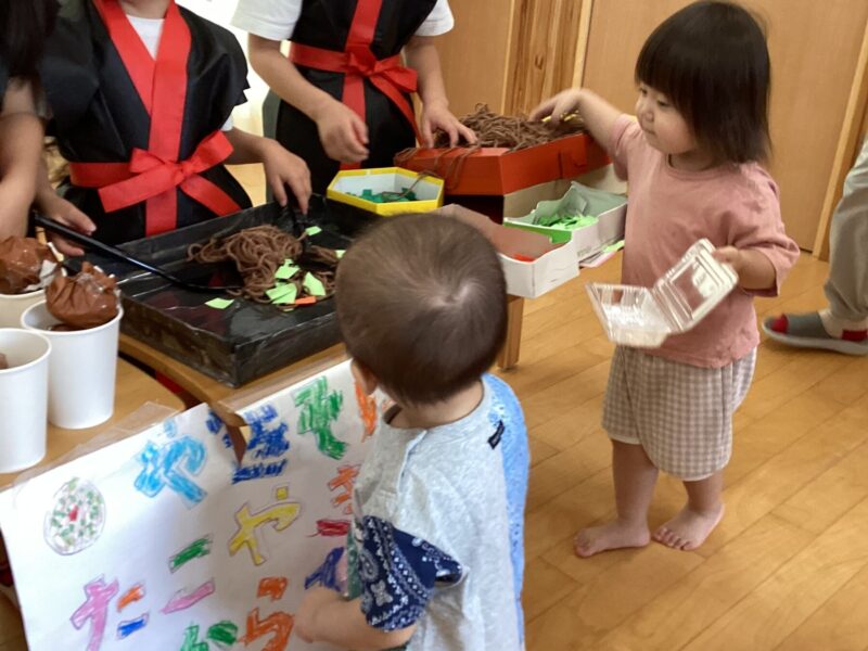 保育室に訪れると様々な出店があり、ハッピを着たお兄さんお姉さんが出迎えてくれました。興味津々の子ども👦🧒たちは、出店で選んだ品物をもらい、とても嬉しそうでした。