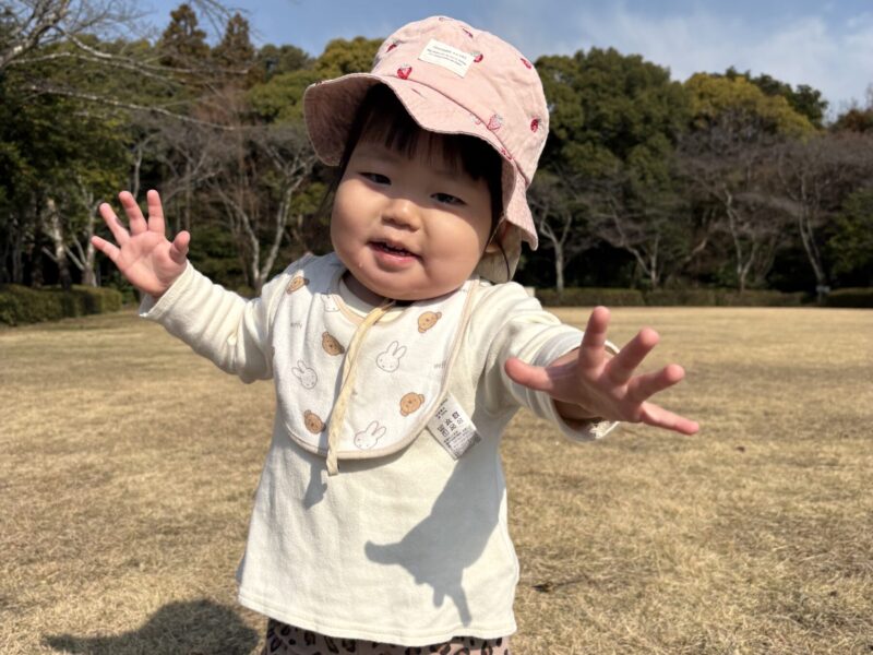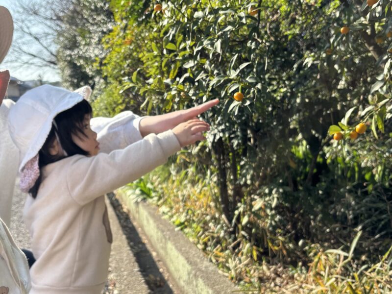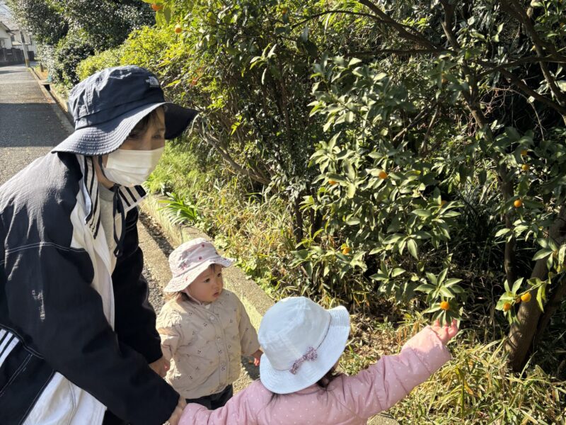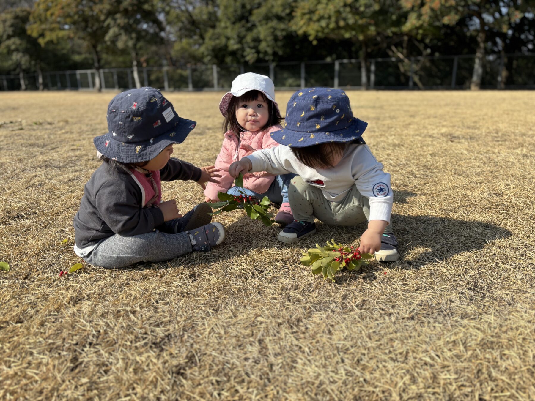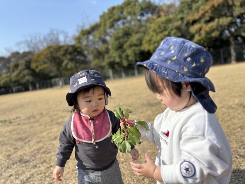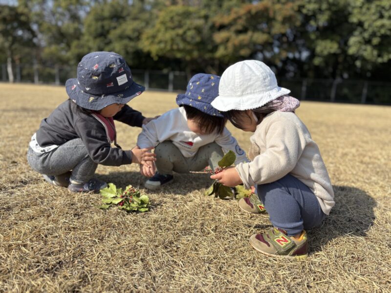 芝生を走ったり、木の実を見つけたりしていました。保育士を追いかけて楽しそうに走っている姿が微笑ましかったです✨また、木の実や葉っぱを見つけると「見て見てー!」と言う様に近くに来て嬉しそうに見せてくれました。「カーカー」とカラスの鳴き声が聞こえると空を指差したり「カーカー」と鳴き声を真似したりして教えてくれる子どももいました😊