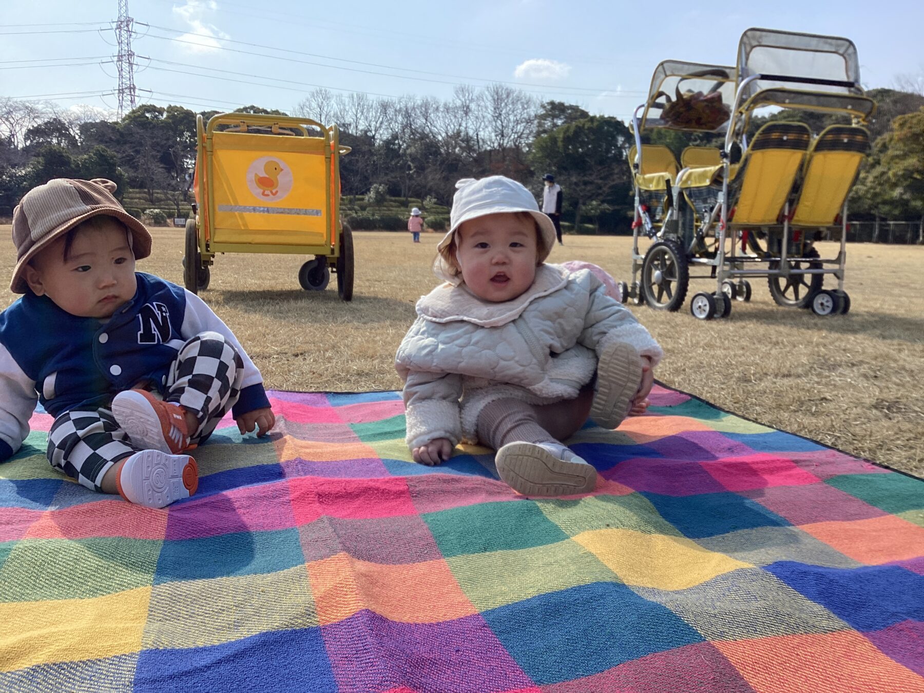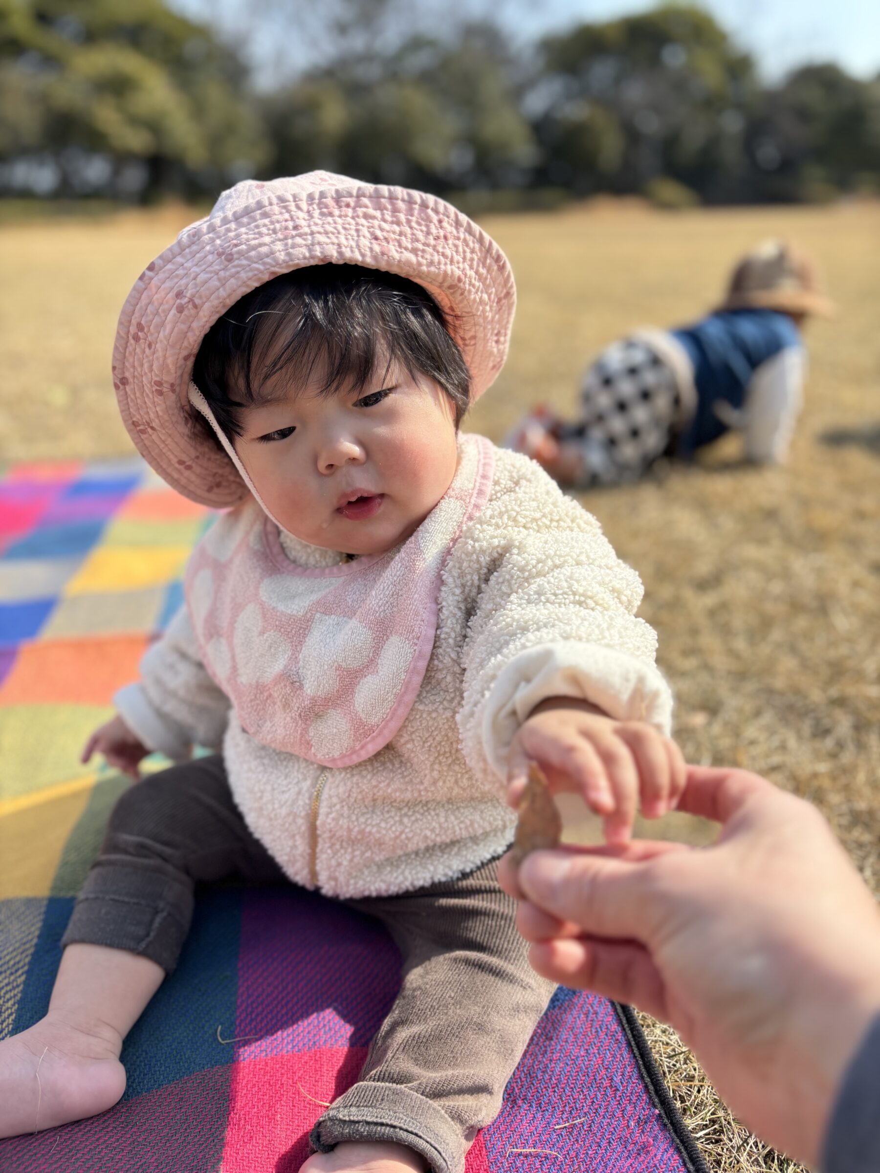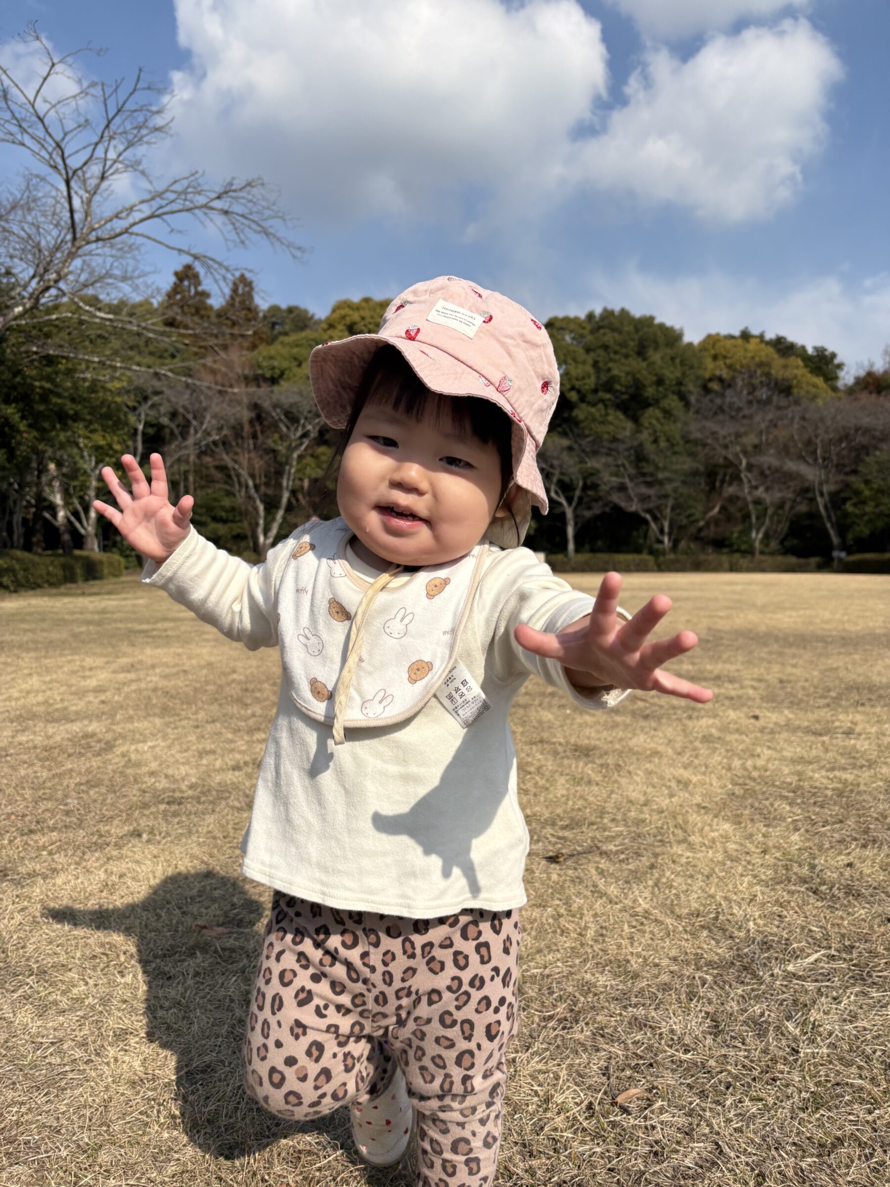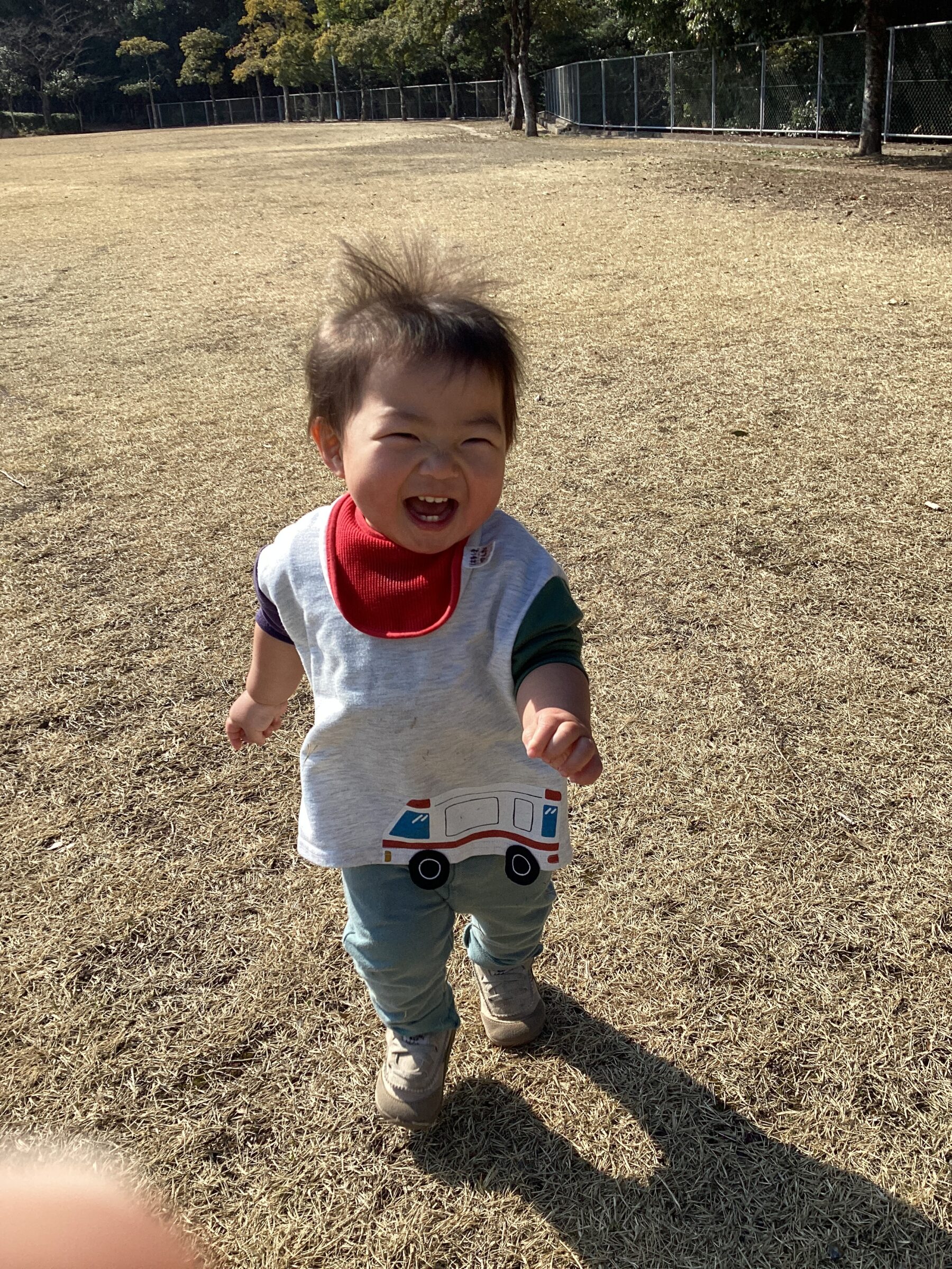 芝生を走ったり、木の実を見つけたりしていました。保育士を追いかけて楽しそうに走っている姿が微笑ましかったです✨また、木の実や葉っぱを見つけると「見て見てー!」と言う様に近くに来て嬉しそうに見せてくれました。「カーカー」とカラスの鳴き声が聞こえると空を指差したり「カーカー」と鳴き声を真似したりして教えてくれる子どももいました😊
