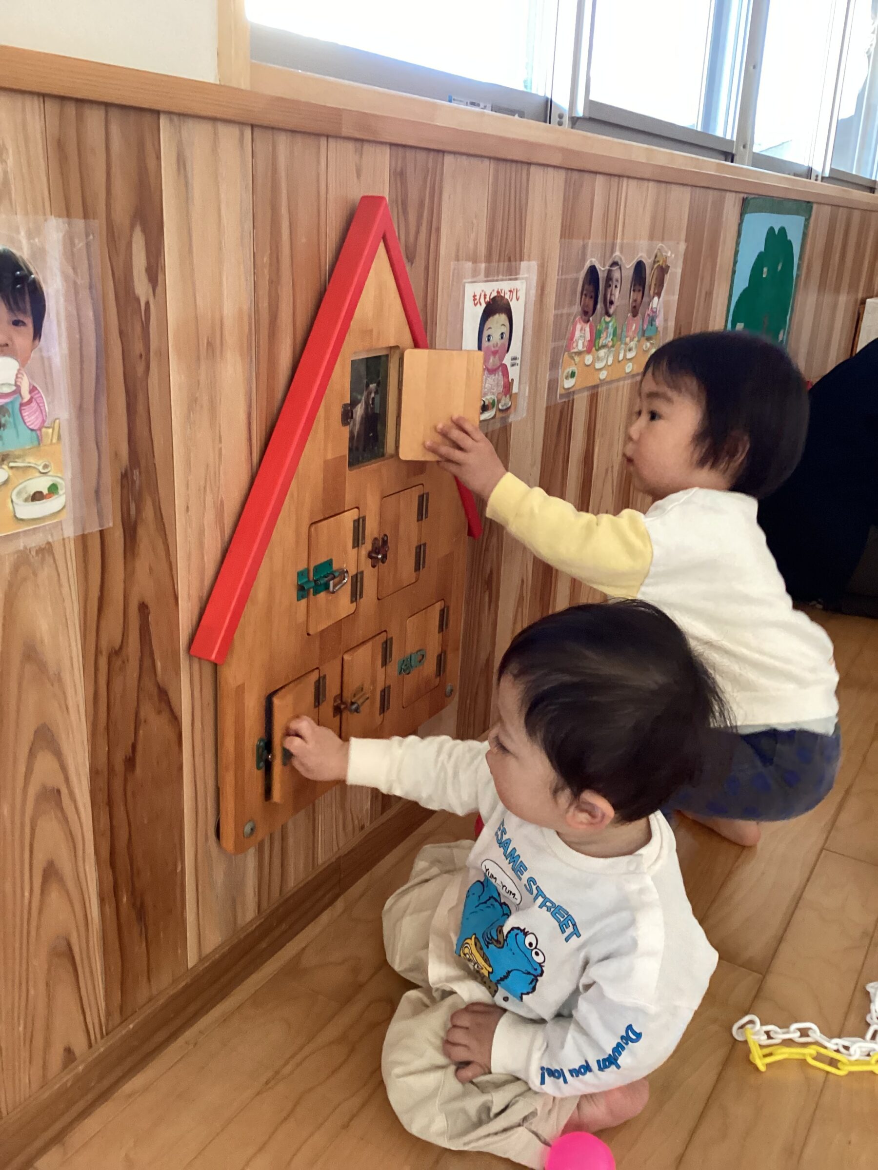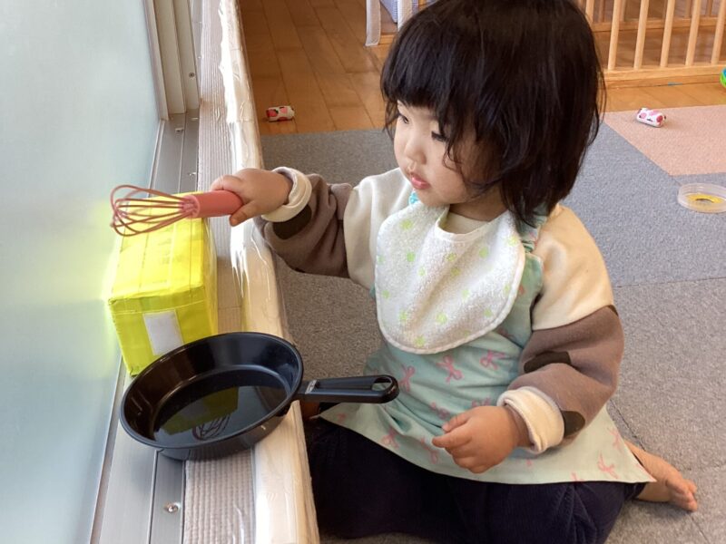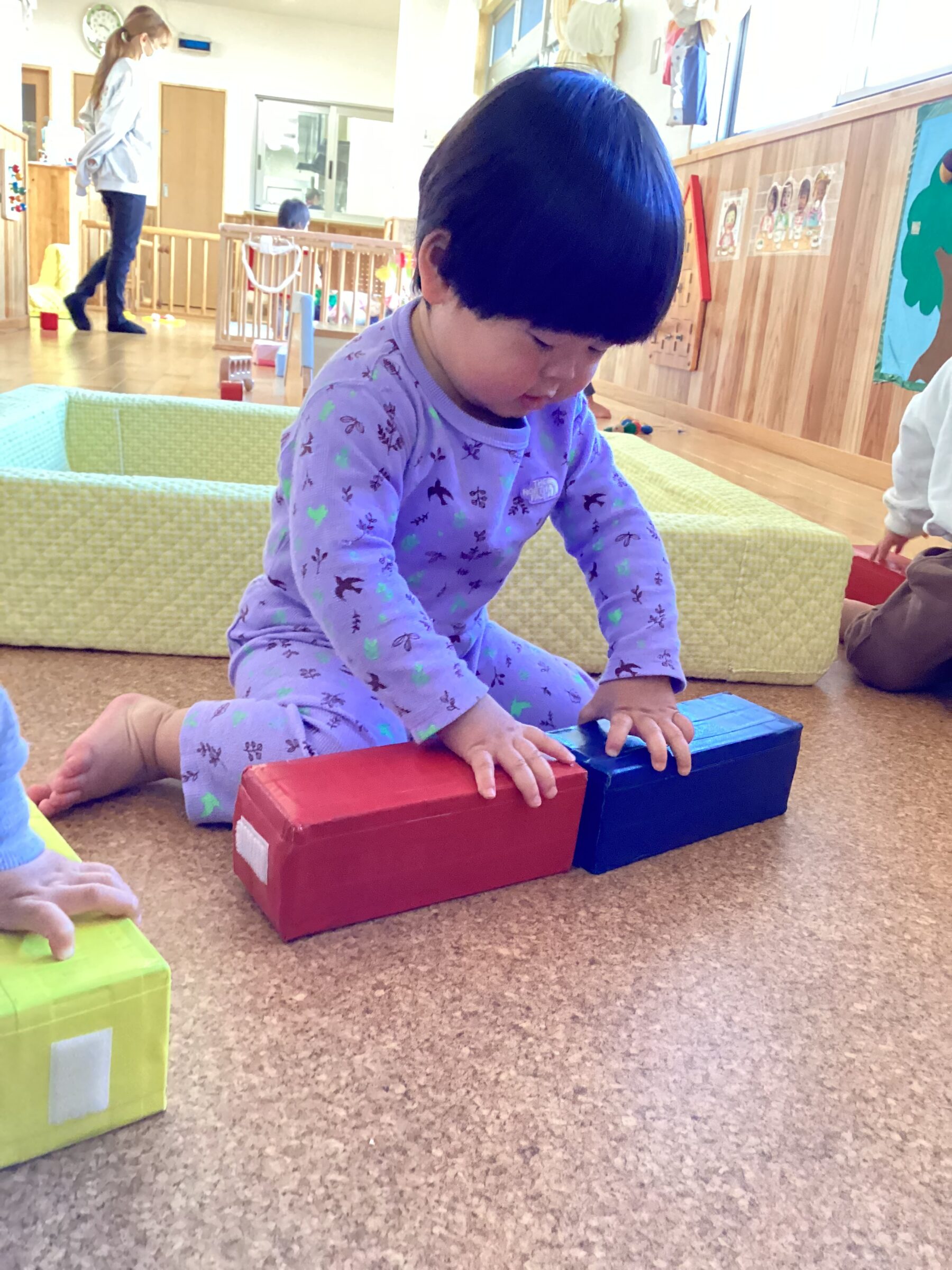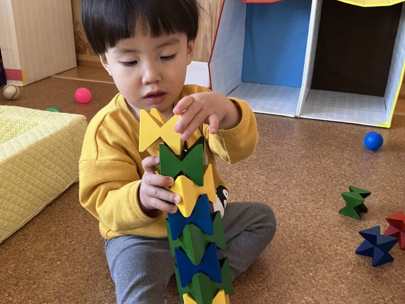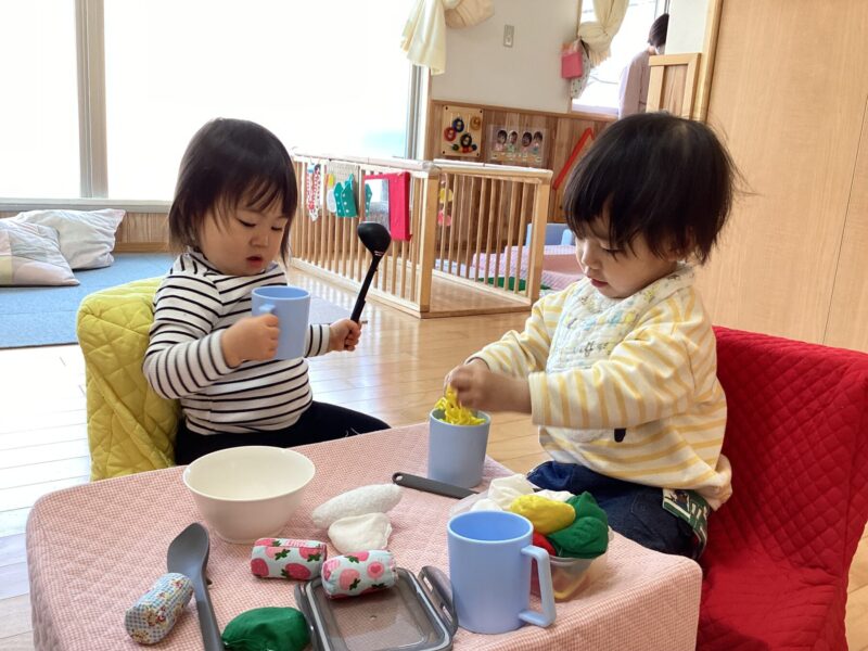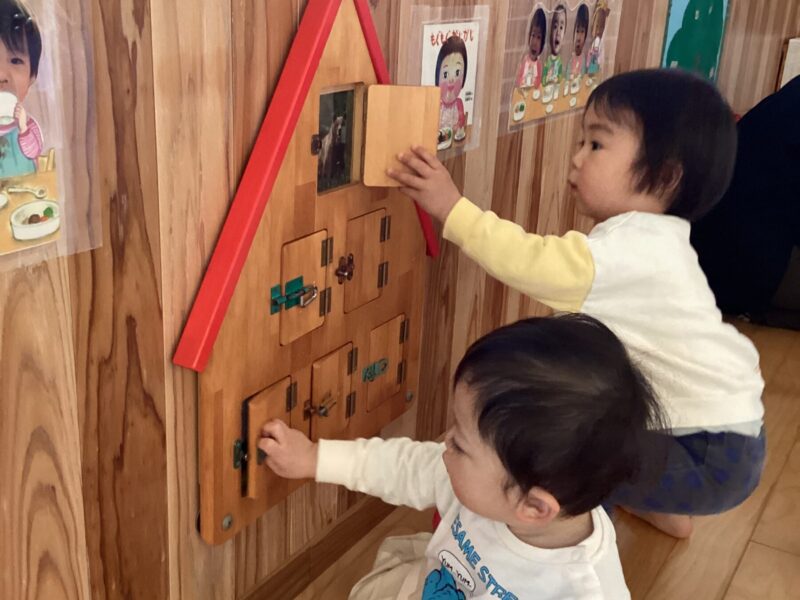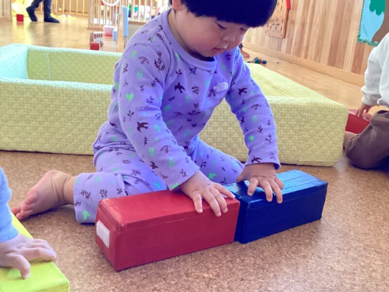 入園当初は側にある玩具で保育士と一緒に遊んでいましたが、今では自分で好きな遊びを見つけてじっくり一人で遊んだり友だちと同じ遊びをしながら笑い合ったりする姿が見られます♡成長、発達に合わせて玩具を手作り玩具を用意することで子どもたちも色々な遊び方を見つけて楽しんでいます✨ さくら組