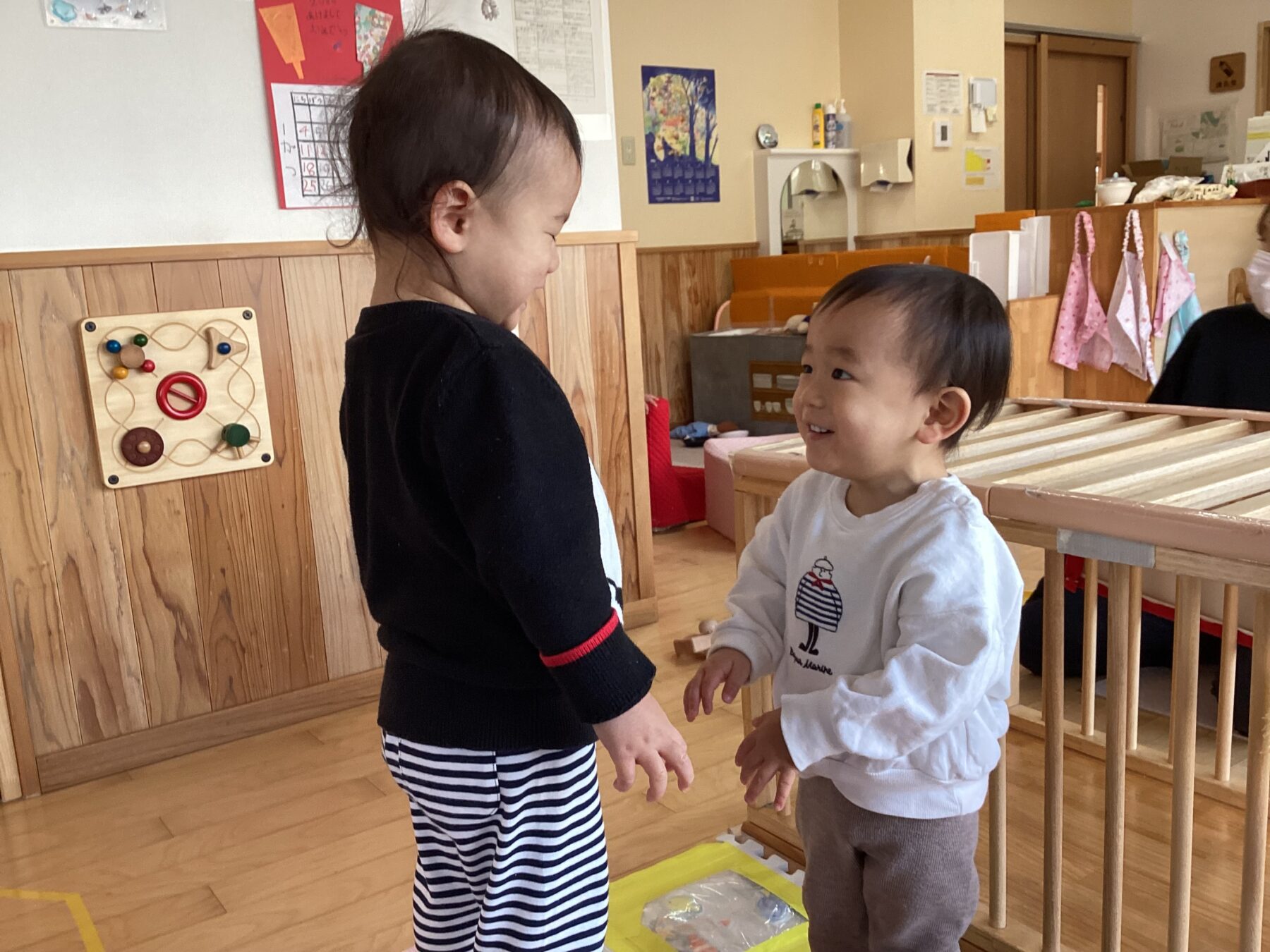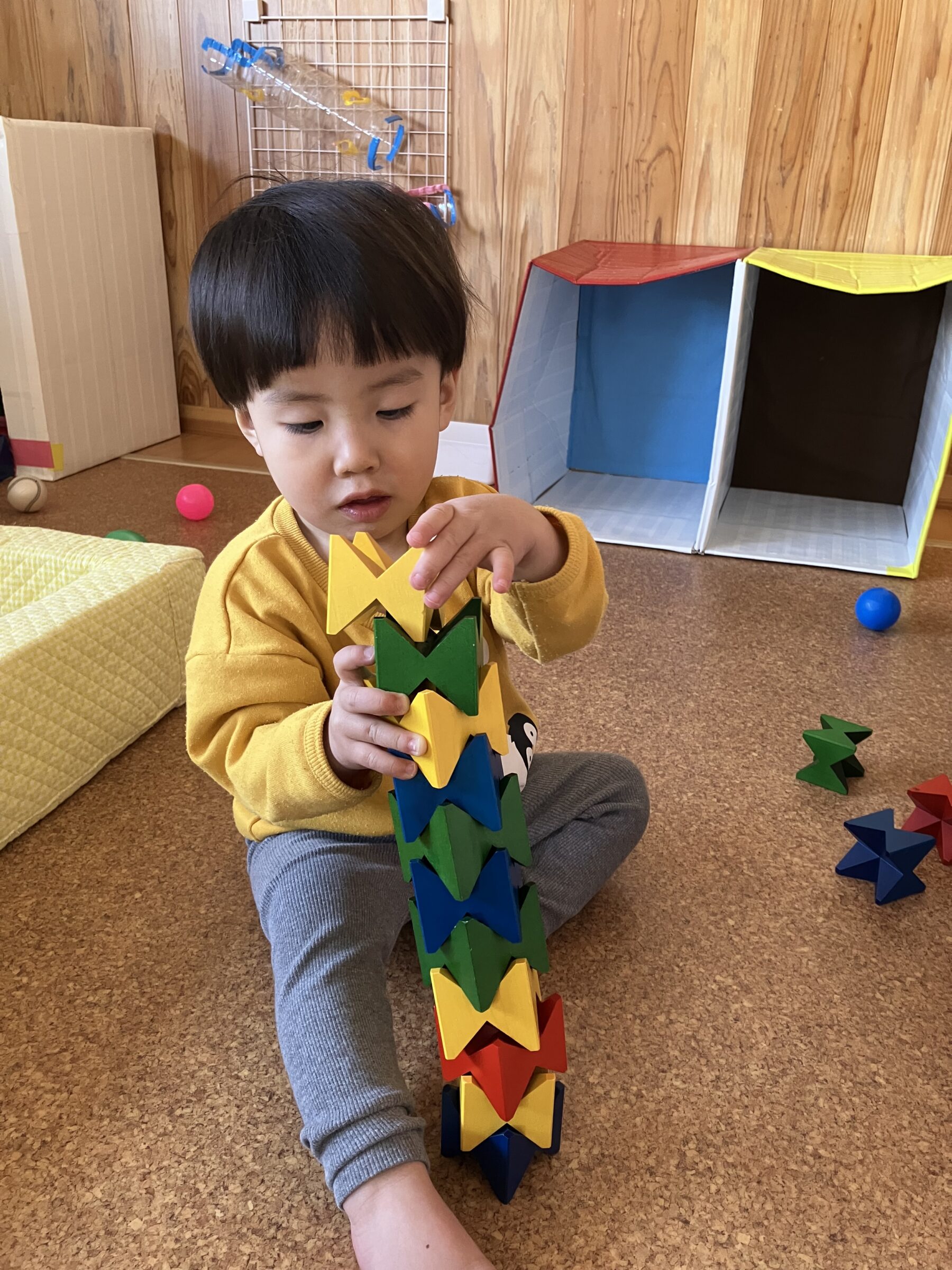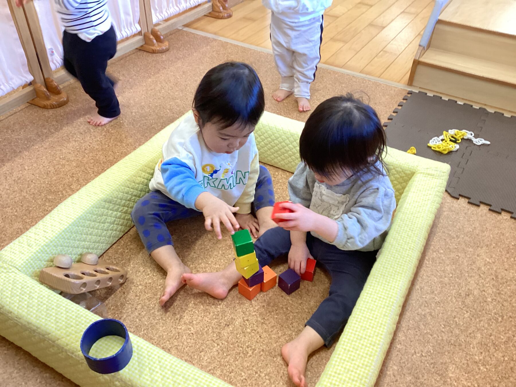 入園当初は側にある玩具で保育士と一緒に遊んでいましたが、今では自分で好きな遊びを見つけてじっくり一人で遊んだり友だちと同じ遊びをしながら笑い合ったりする姿が見られます♡成長、発達に合わせて玩具を手作り玩具を用意することで子どもたちも色々な遊び方を見つけて楽しんでいます✨ さくら組