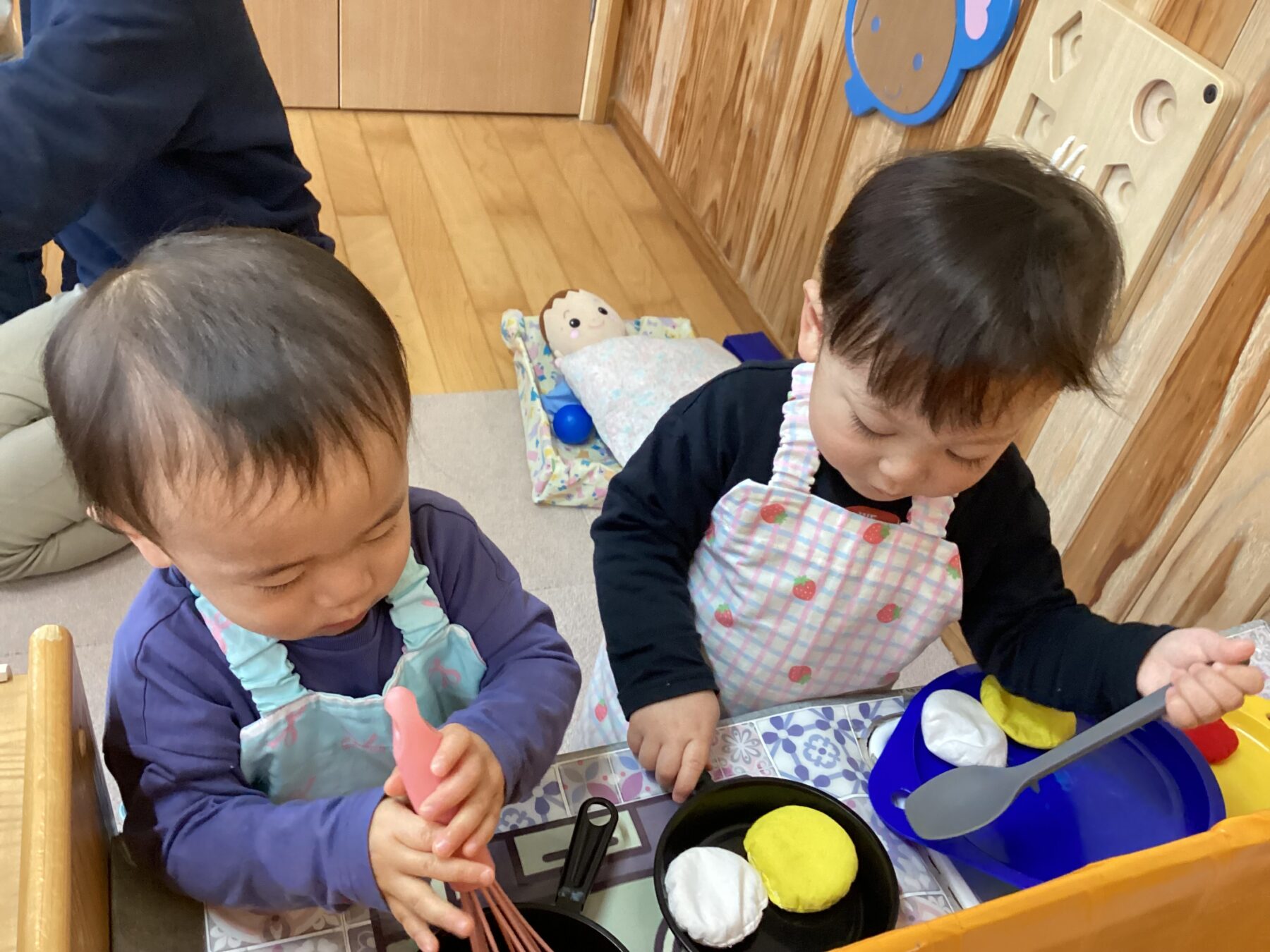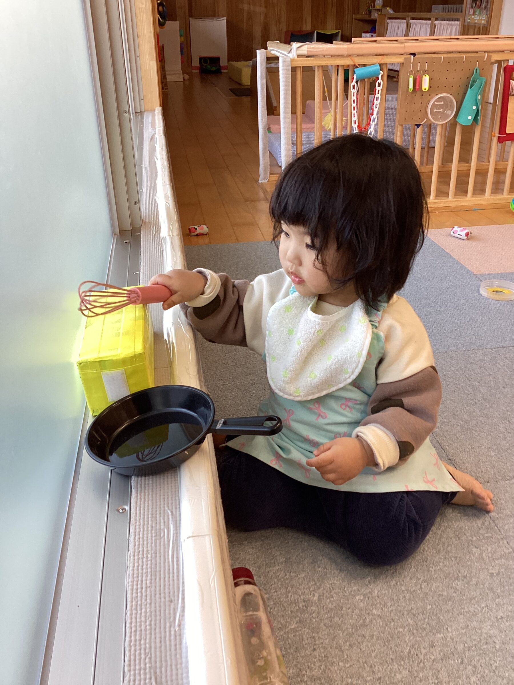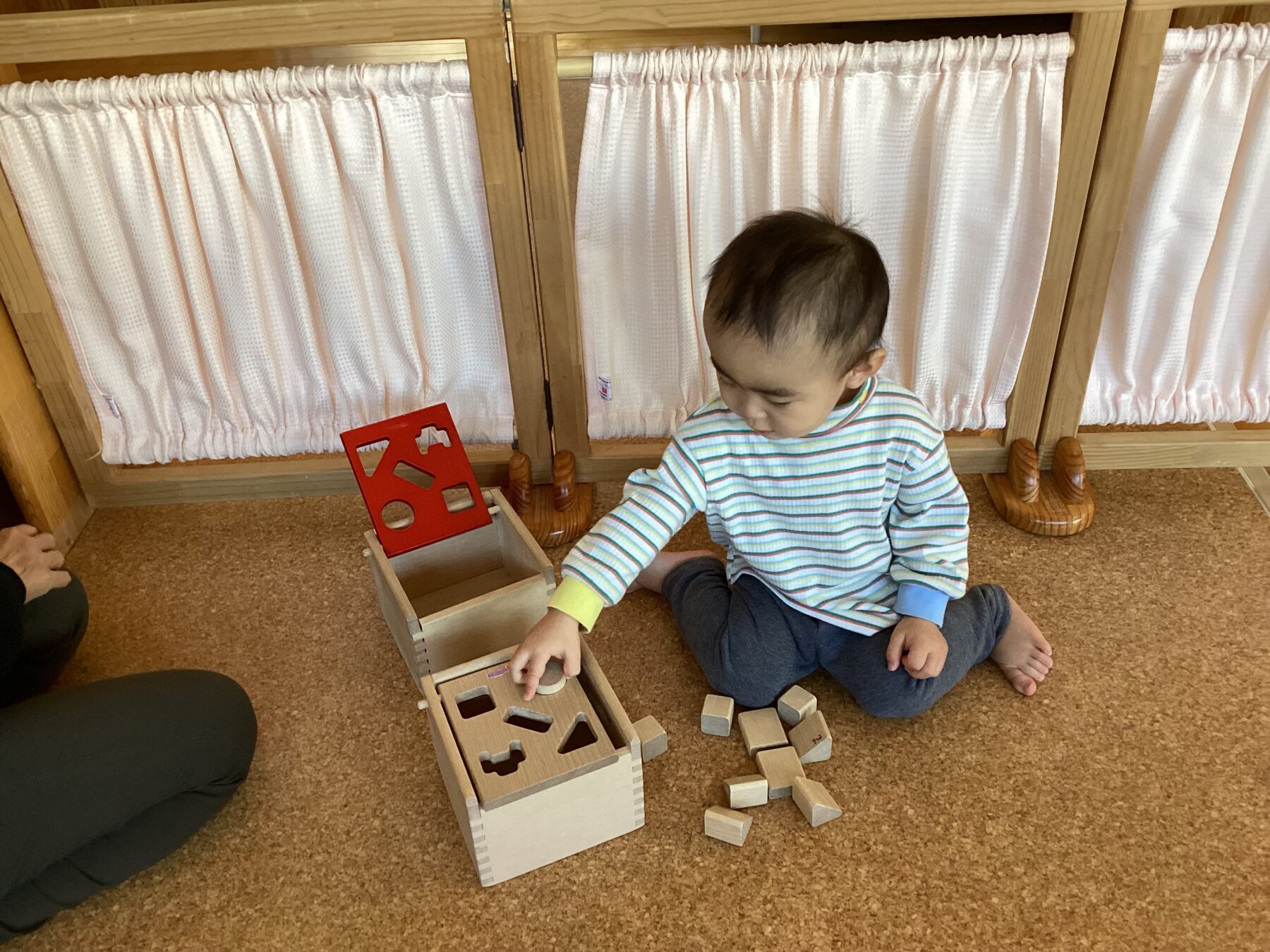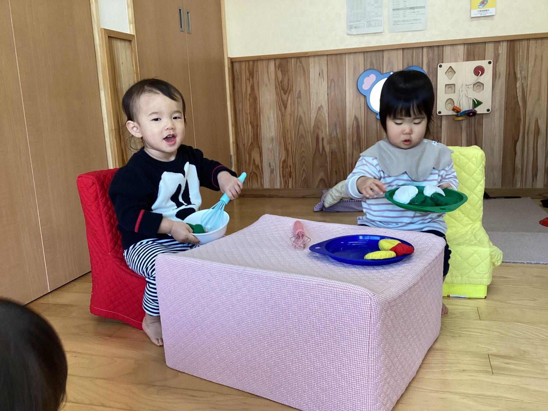 入園当初は側にある玩具で保育士と一緒に遊んでいましたが、今では自分で好きな遊びを見つけてじっくり一人で遊んだり友だちと同じ遊びをしながら笑い合ったりする姿が見られます♡成長、発達に合わせて玩具を手作り玩具を用意することで子どもたちも色々な遊び方を見つけて楽しんでいます✨ さくら組