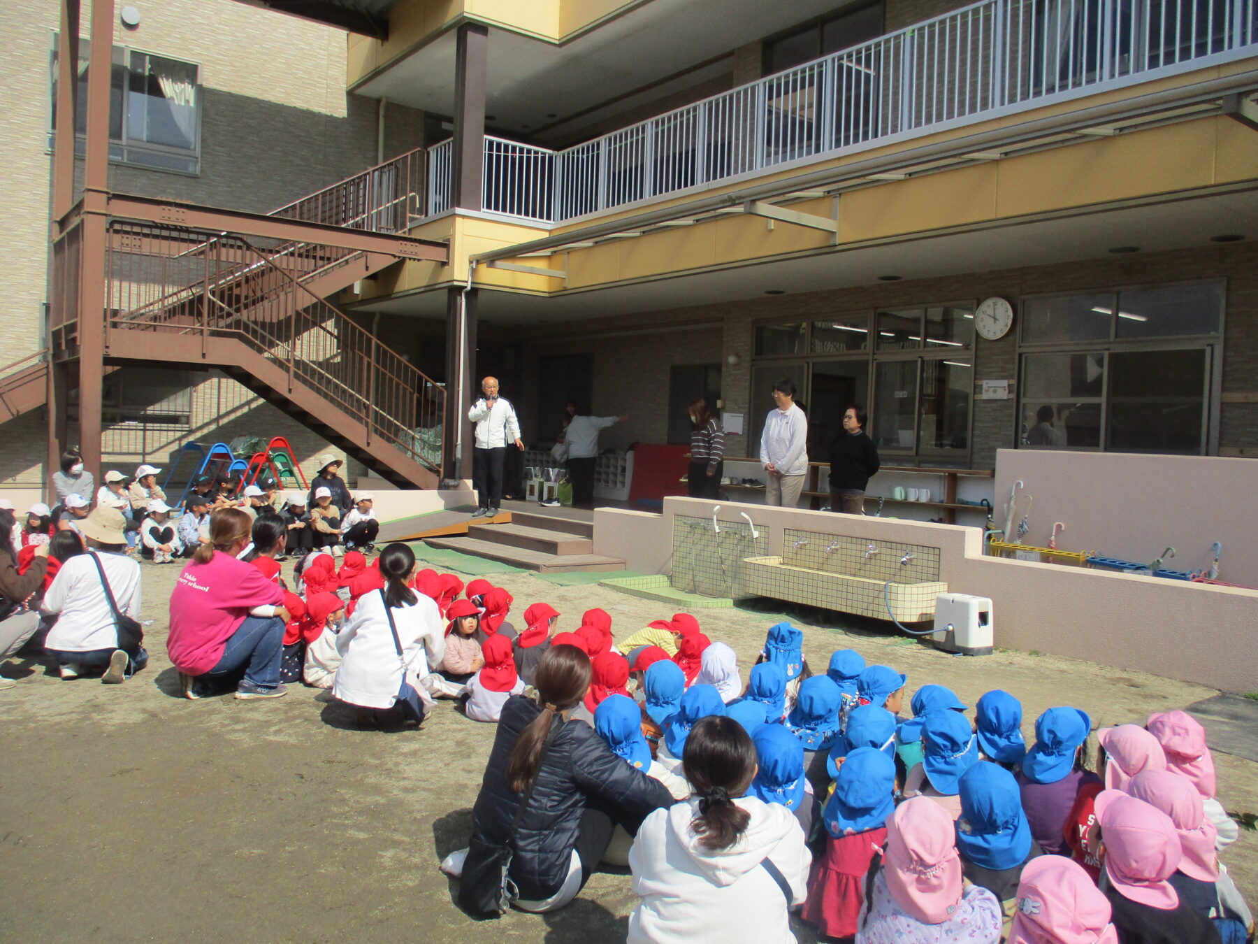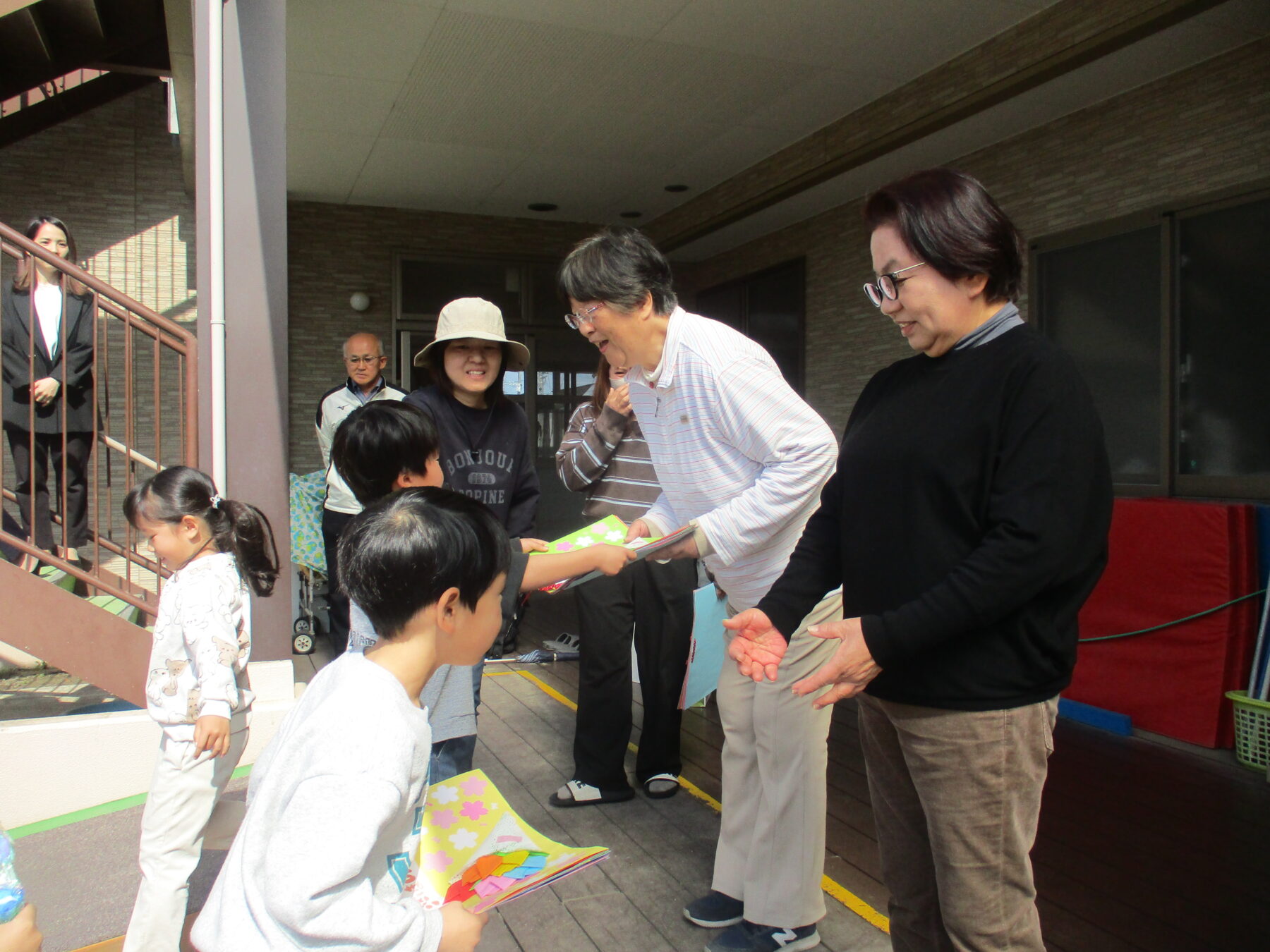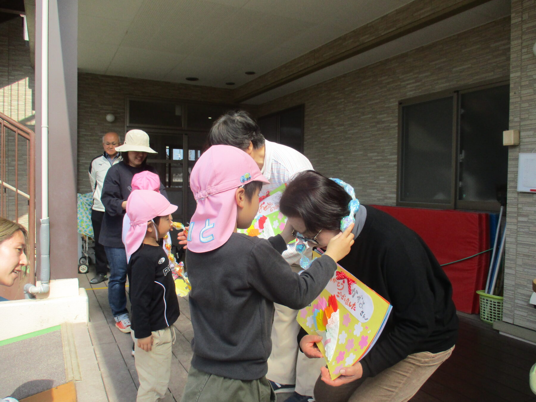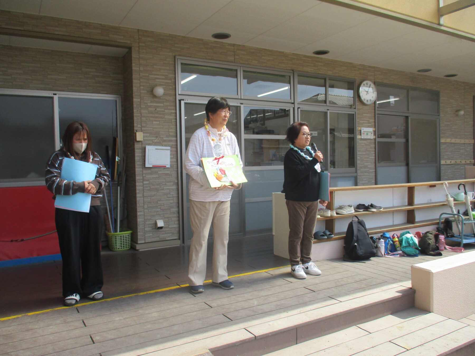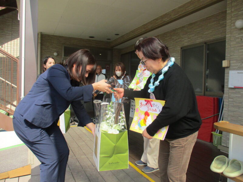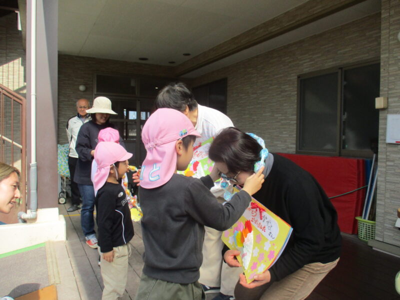 今日は3月いっぱいで退職する和代さん、秀子さん、沙紀さんのお別れ会がありました。メッセージアルバムと手作りのネックレスを子どもたちからプレゼントしました。お別れ会には保護者会の役員さんも来てくださり、花束を贈呈してお別れの言葉をいただきました![]()