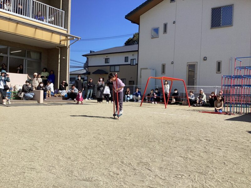 また、2部の最後にはきく組の子ども達のチャレンジ発表があり、雲梯や長縄、けん玉など、がんばってきたことを発表しました